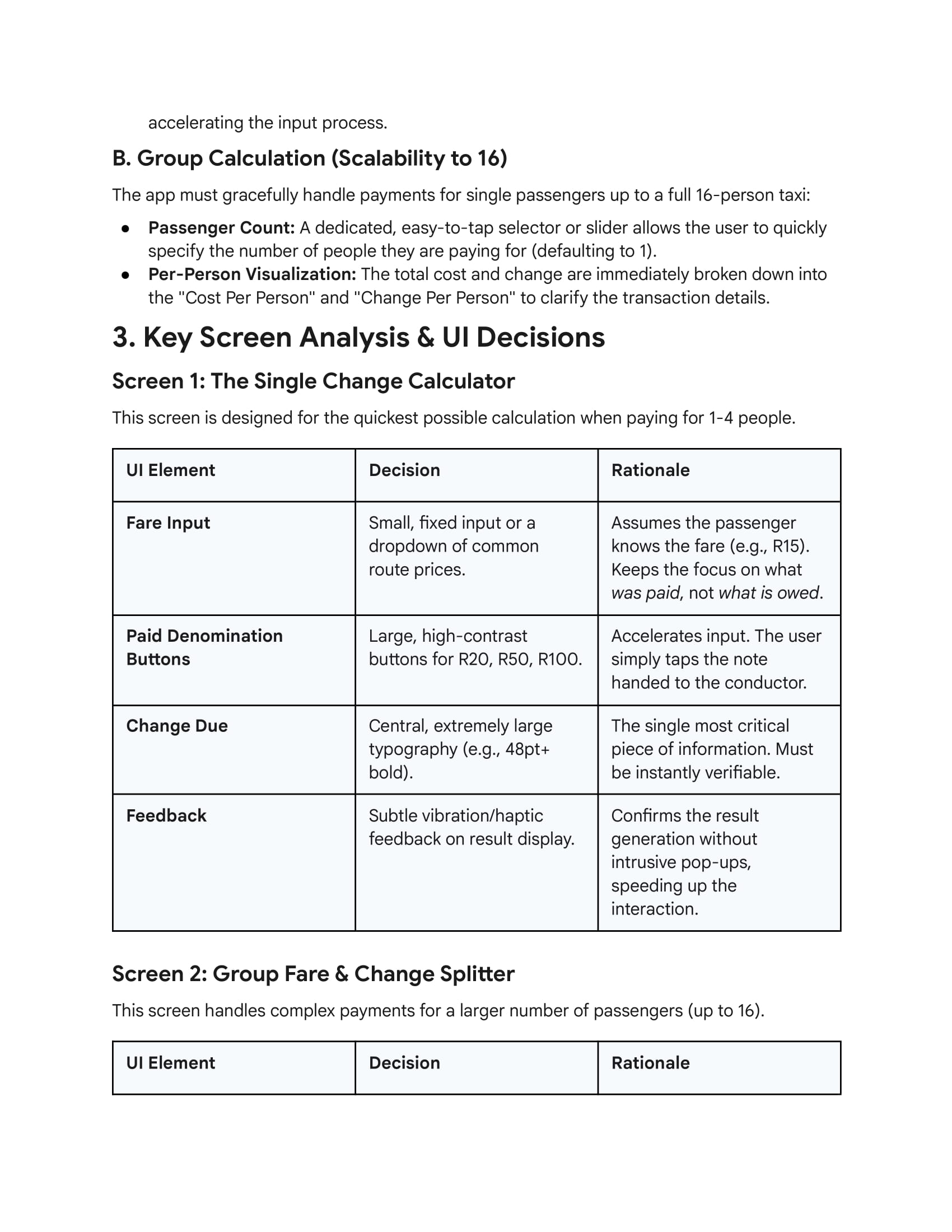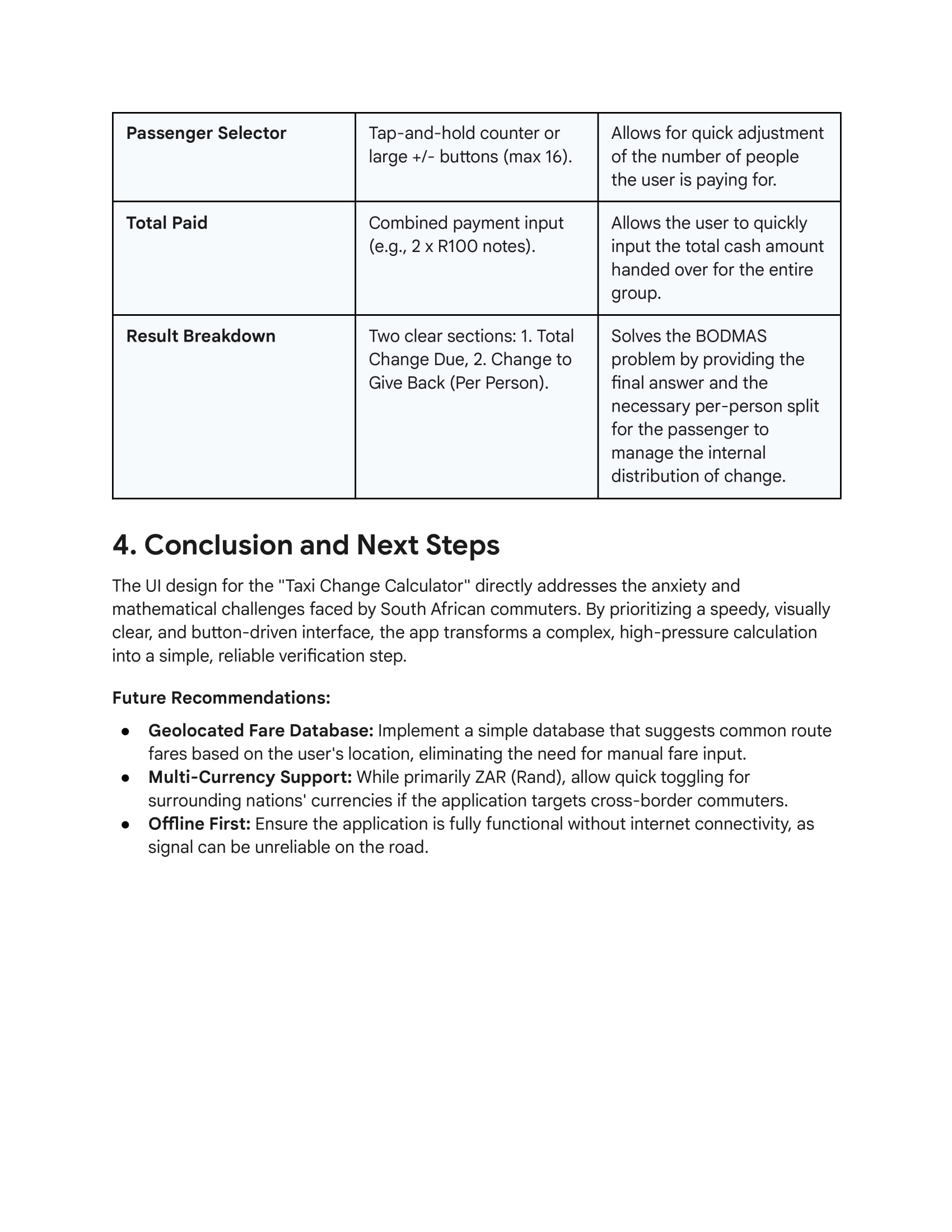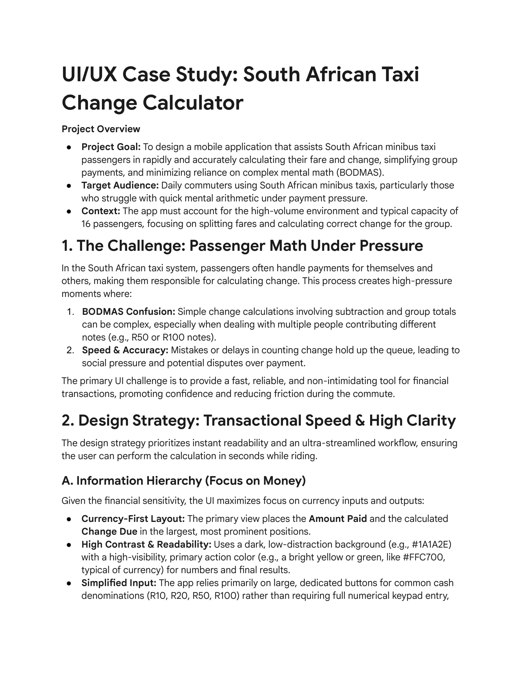 To design a mobile application that assists South African minibus taxi passengers in rapidly and accurately calculating their fare and change, simplifying group payments, and minimizing reliance on complex mental math (BODMAS).Target Audience: Daily commuters using South African minibus taxis, particularly those who struggle with quick mental arithmetic under payment pressure.Context: The app must account for the high-volume environment and typical capacity of 16 passengers, focusing on splitting fares and calculating correct change for the group.UI/UX Case Study: South African Taxi Change CalculatorProject OverviewProject Goal: To design a mobile application that assists South African minibus taxi passengers in rapidly and accurately calculating their fare and change, simplifying group payments, and minimizing reliance on complex mental math (BODMAS).Target Audience: Daily commuters using South African minibus taxis, particularly those who struggle with quick mental arithmetic under payment pressure.Context: The app must account for the high-volume environment and typical capacity of 16 passengers, focusing on splitting fares and calculating correct change for the group.